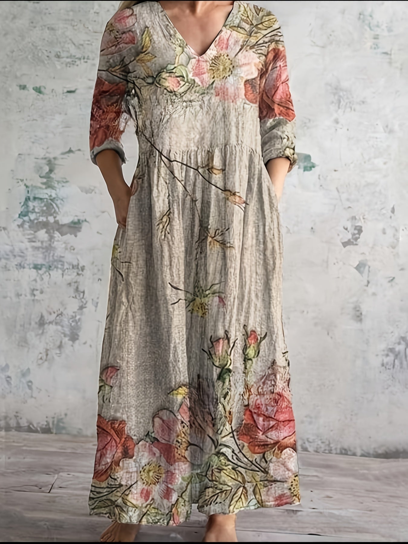 Step into the soft romance of vintage style with the Marlie Dress a floral midi crafted to blend classic charm with modern ease. With its flattering V-neckline, breezy 3/4 sleeves, and hidden side pockets, this dress keeps you feeling feminine, comfortable, and effortlessly elegant all day long.