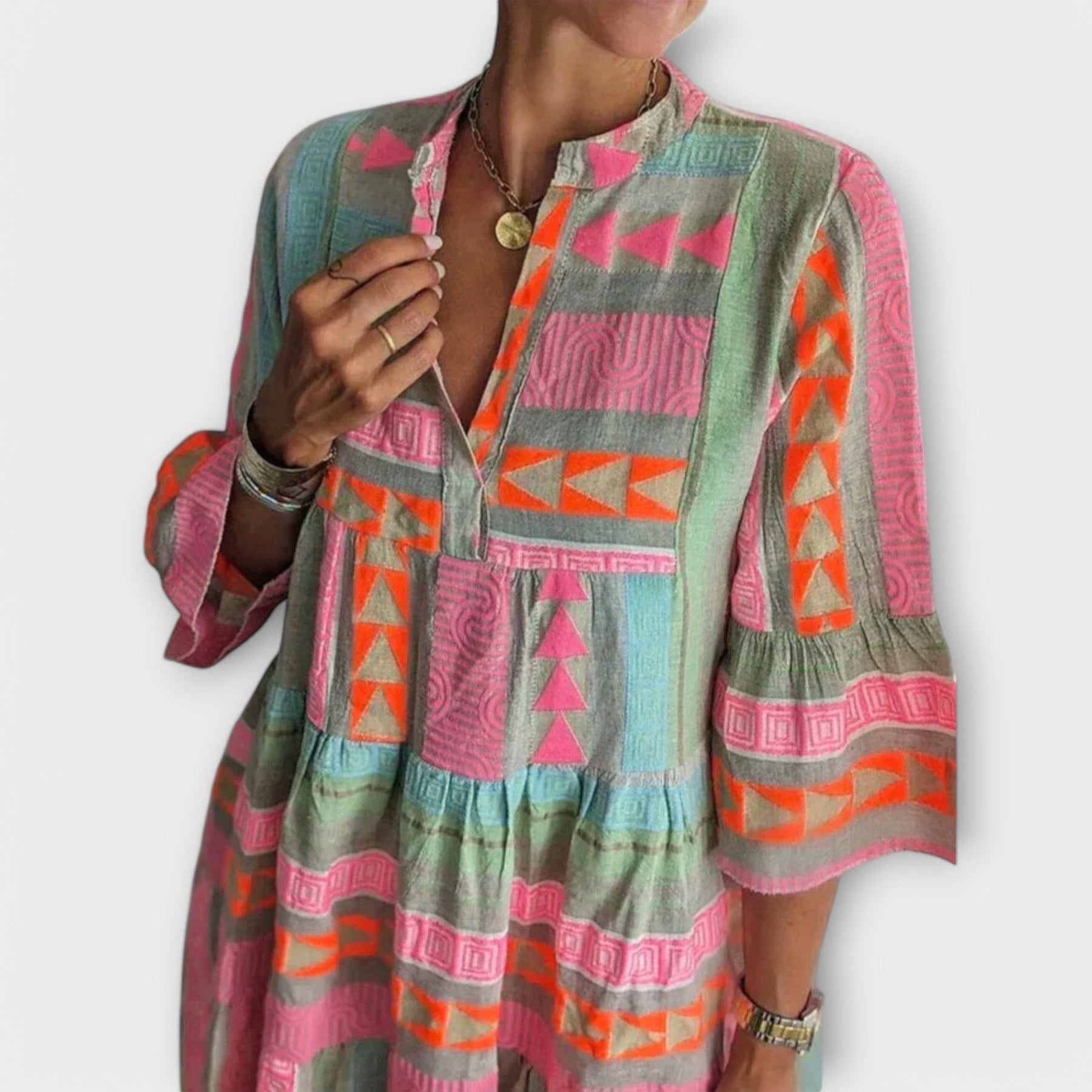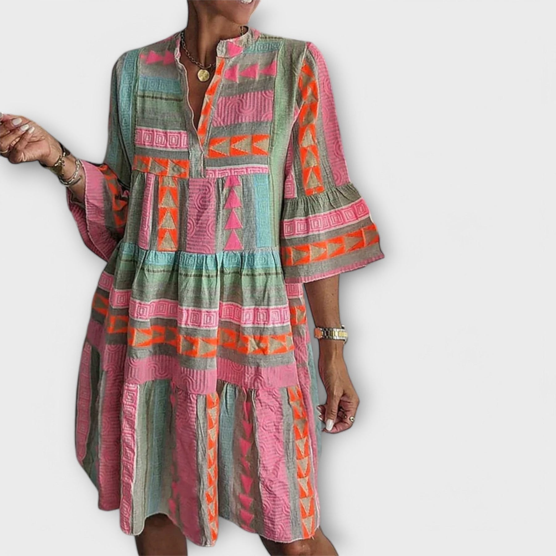 Wherever you go, the Mabel dress will catch attention and brighten your face with a smile. With its elegant mini design and eye-catching pattern, this dress is perfectly tailored and features a deep V-neckline. Pair it with your favorite sandals and feel truly special!