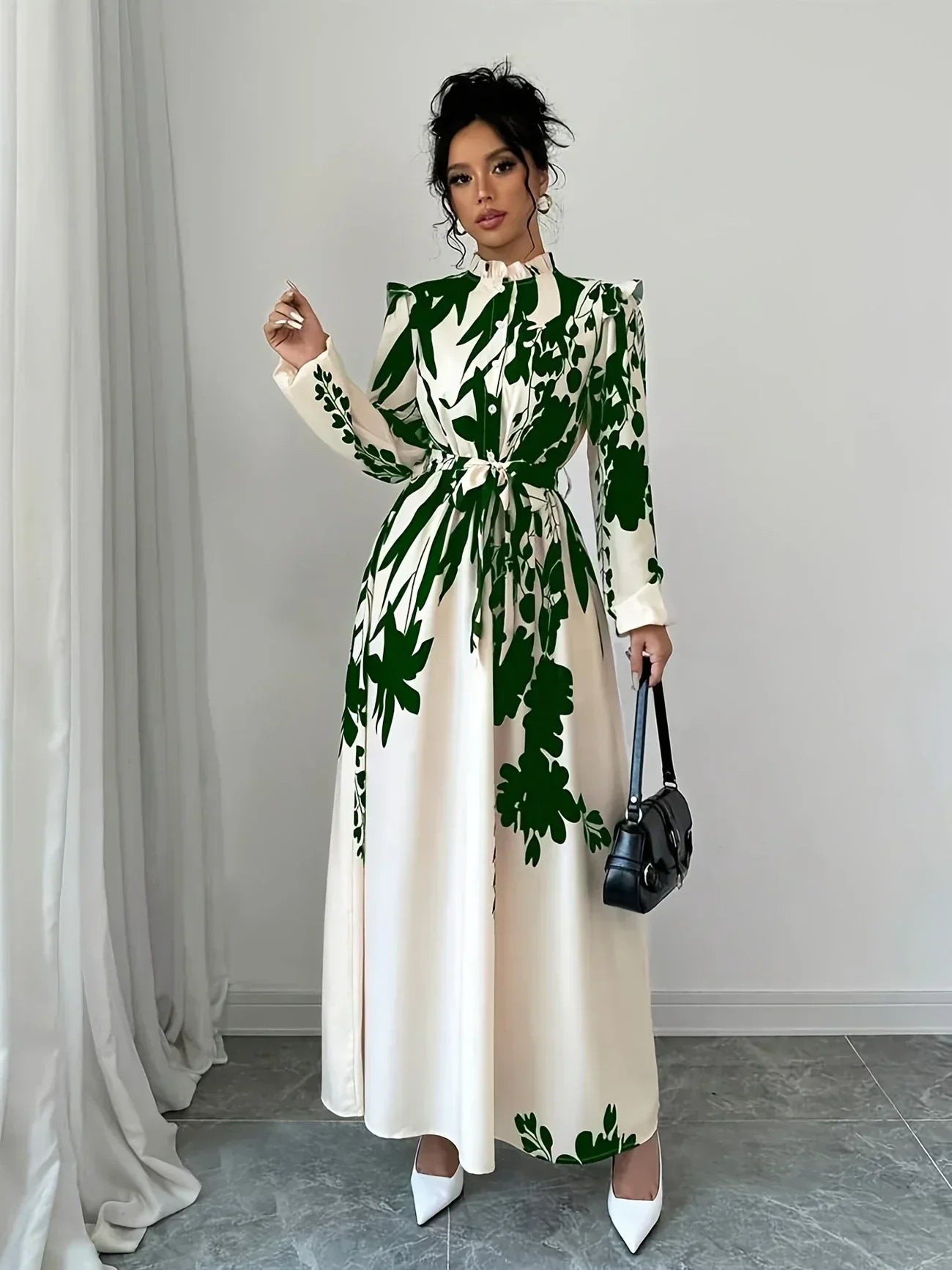 This elegant dress with a delicate pattern combines timeless charm with graceful style, making it perfect for any special occasion or sophisticated outing. The floral design adds a romantic touch, while the flattering silhouette enhances your natural figure. Crafted from soft, flowing fabric, this dress offers comfort and elegance in one.